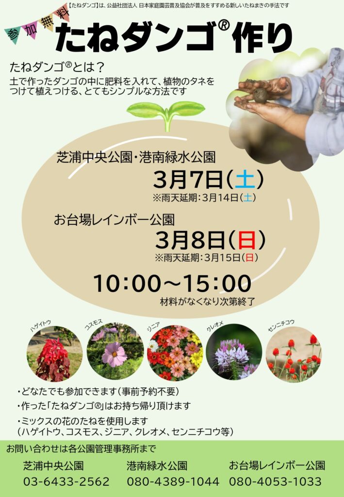 3/7(土)、 8(日)『たねダンゴ作り』開催のお知らせ<芝浦中央・港南緑水・お台場レインボー公園>
