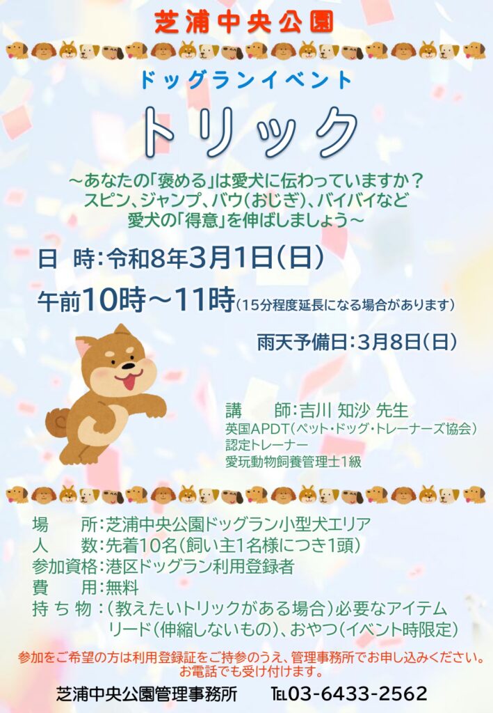 持 物:(教えたいトリックがある場合)必要なアイテム、リード(伸縮しないもの)、おやつ(イベント時限定)